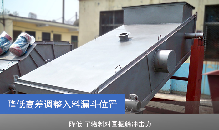 針對沖擊力過大的問題,通過降低漏斗出料端 和圓振動篩入料端的高差,很大程度上降低 了物料(特別是大塊狀物料,如:礦石)對圓振篩沖擊力,使圓振篩受力較為均衡,有效解決了箱體開裂、縱梁斷裂等問題。 同時為了解決礦石在入料端口分布不均的情 況,在入料口加寬入料漏斗位置,從而使物料均勻地分布于整個篩面,使篩分效率大大提高。